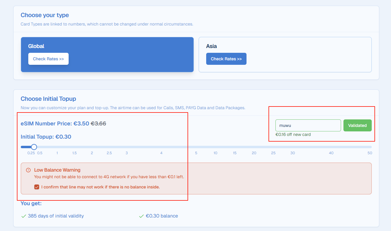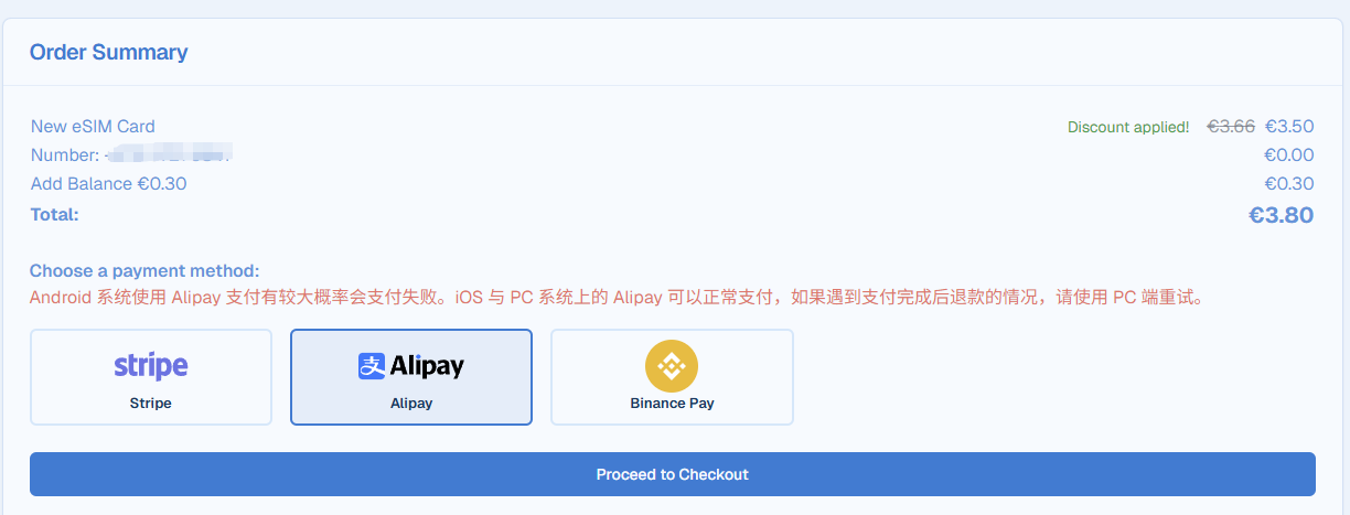 上面也说了网址,直接浏览器打开,进入购买,进入到购买界面就有简体中文了,往下拉选择全球地区,输入邀请码(muwu)可以减0.16欧,不然开卡费就要3.66欧,下面那个充值金额最低就是0.3欧,需要勾选那个提示才能拉到0.3欧,之后就是选择个自己喜欢的号码,这里因为只充值0.3欧所以可选的免费号码比较少(嗯靓号也是要收费的),最后支付宝完成支付,这个非常贴心,直接用支付宝就行。