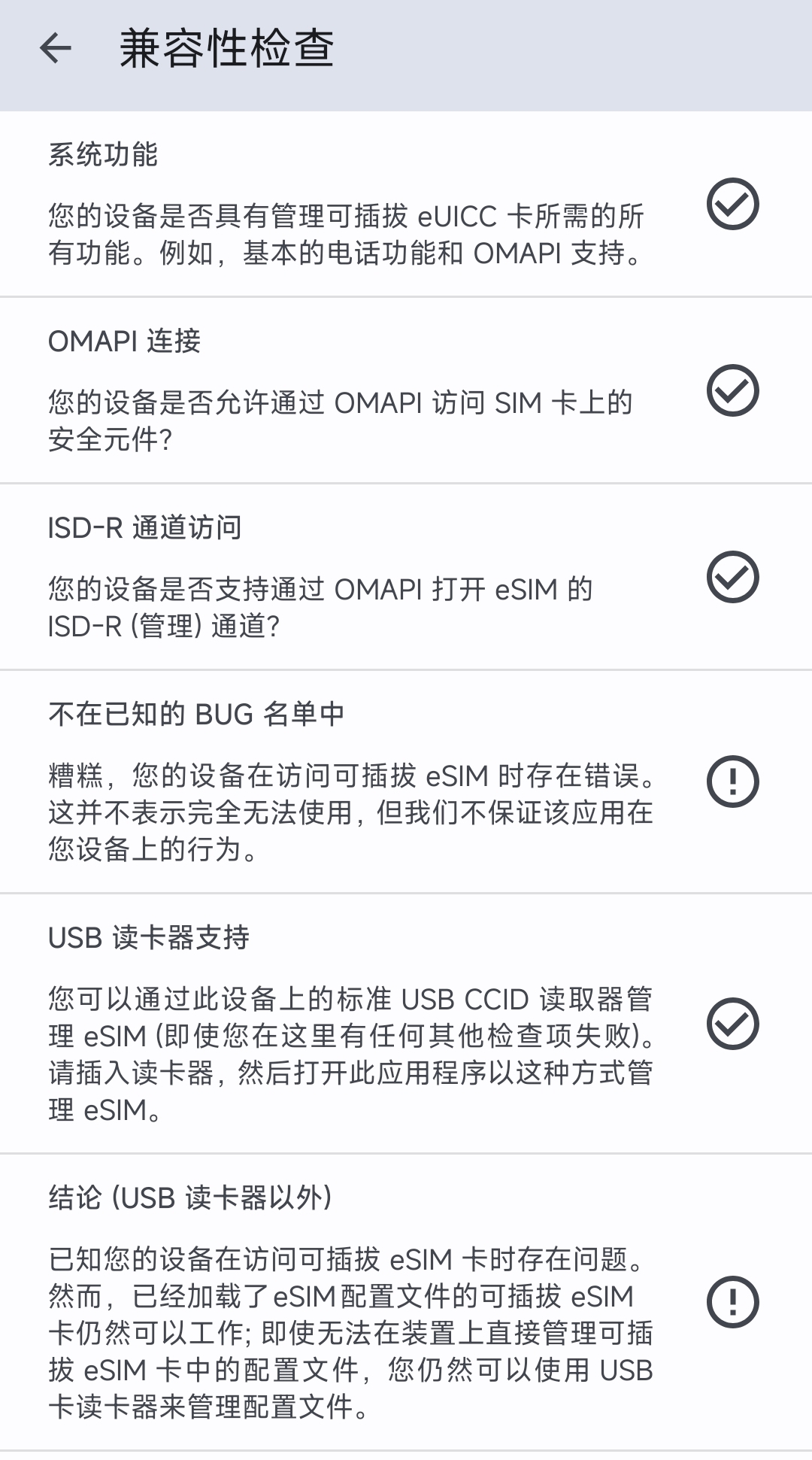 安卓写入需要用到一个叫做“easyeuicc”的app,这个自己谷歌下载,安装好后可以运行检测下,前三项能通过就没问题,基本上大部分手机都可以通过,我这好几年前的红米都可以,至于后面几项不用管。对了,有些手机只能sim卡1槽才支持写卡,卡2槽不行,,,,