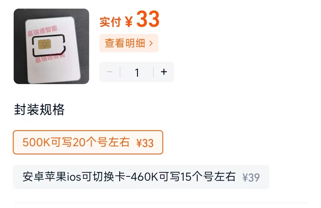 可能大火有听说过5ber/9esim这种,其实都是euicc卡,只是前者有牌子,卖的非常贵,普通euicc卡俗称小白卡,即小作坊产品,质量不好说(有人写入一次就炸鸡),但是非常便宜,40不到就能拿下(500k容量)。需要注意的是,安卓目前写入和切卡(切换euicc内的esim信息)非常方便,但是苹果只能切卡,而且需要特定的euicc才支持,这类euicc也要贵几块钱,如果自己用苹果的建议买海外esim版的。