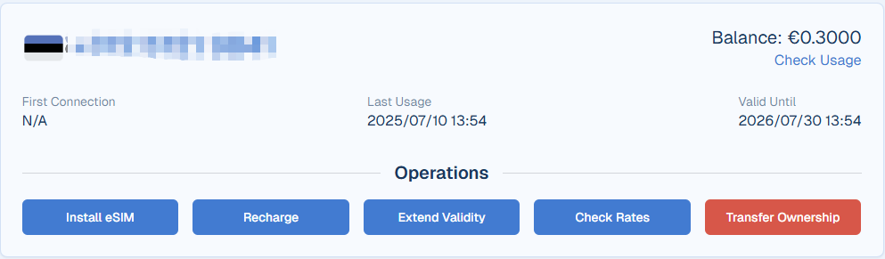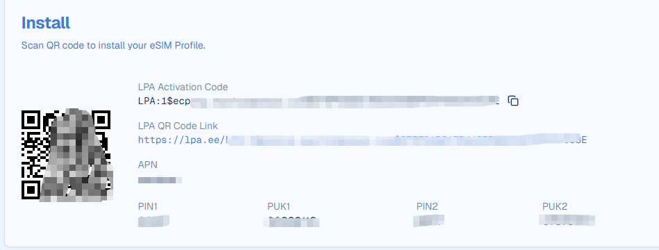 支付完成后就可以下卡了,自己账户里面就会出现这个号码,选择install esim,就会出现二维码,此时用支持esim的手机扫描就可以下卡了,如果自己手机不支持esim,就需要写入到实体sim卡。